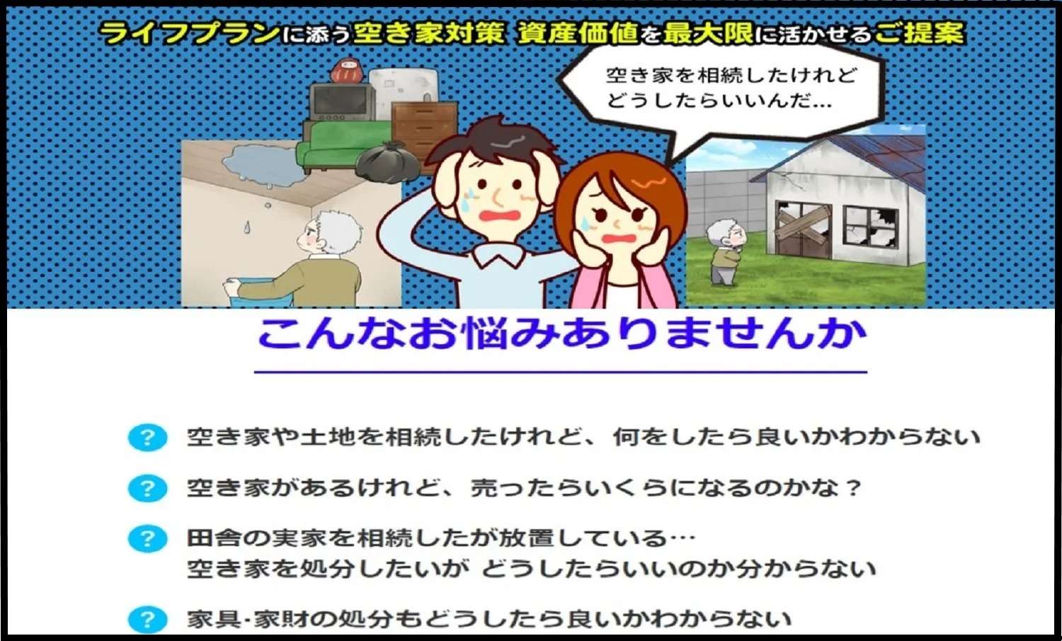 近年、社会問題となっております「空き家問題」は、不動産業に従事する者にとっても非常に重大な命題を突きつけられていると感じております。重大な命題とは、所有者様の土地・建物の有効な活用提案を、不動産業に従事する者が、適切なご提案が出来ていないからこそ、空き家・空き地が増えているという事実です。